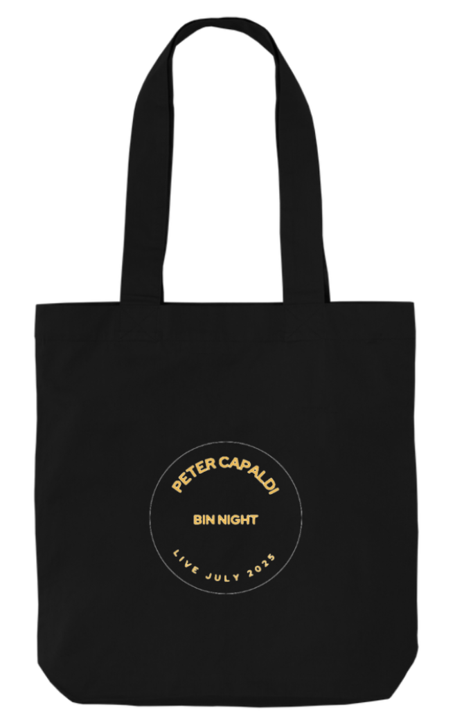 Available in all sizes, this Organic Cotton Black Tote features Peter's own Bin Night painting - with tour details on the rear.