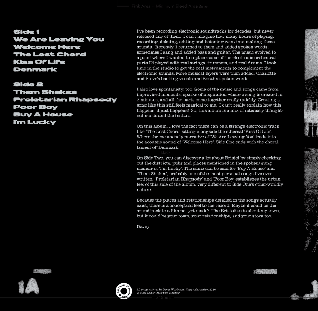The Bristolian is the new 2026 solo album from Bristol-based musician Davey Woodward. Released in September 2026 on LIMITED RUN. This stunning unique album is full of twists and turns ranging from spoken word to melancholy to Balearic uplifting electronic beats.